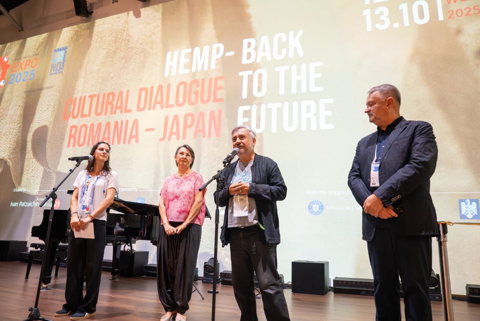 The scientific contribution of Dr. Florica Zaharia, Curator Emerita of The Metropolitan Museum of Art, Director and Co-founder of the Textile Museum in Băița, underpinned the initiative through rigorous documentation of the tangible and intangible heritage of hemp in Romania and Japan, extending to its contemporary applications. Hemp has been an active element of Romanian and Japanese rural heritage in international cultural exchanges. The project offered the public an experience of intercultural dialogue through the exhibition of Romanian and Japanese heritage pieces, contemporary art installations, and a research album on the theme of traditional costumes from Romania and Japan, authored by Dr. Florica Zaharia and Midori Sato. The opening ceremony brought together representatives of the Bureau International des Expositions (BIE), national and international cultural institutions, and officials from other pavilions. Mr. Ferdinand Nagy, General Commissioner of the Romanian Pavilion, marked the opening alongside Dr. Florica Zaharia, curator emerita at the Metropolitan Museum of Art and director of the Textile Museum in Băița, and architect Teodor Frolu, the exhibition’s curator and co-founder of the Ivan Patzaichin – Mila 23 Association.