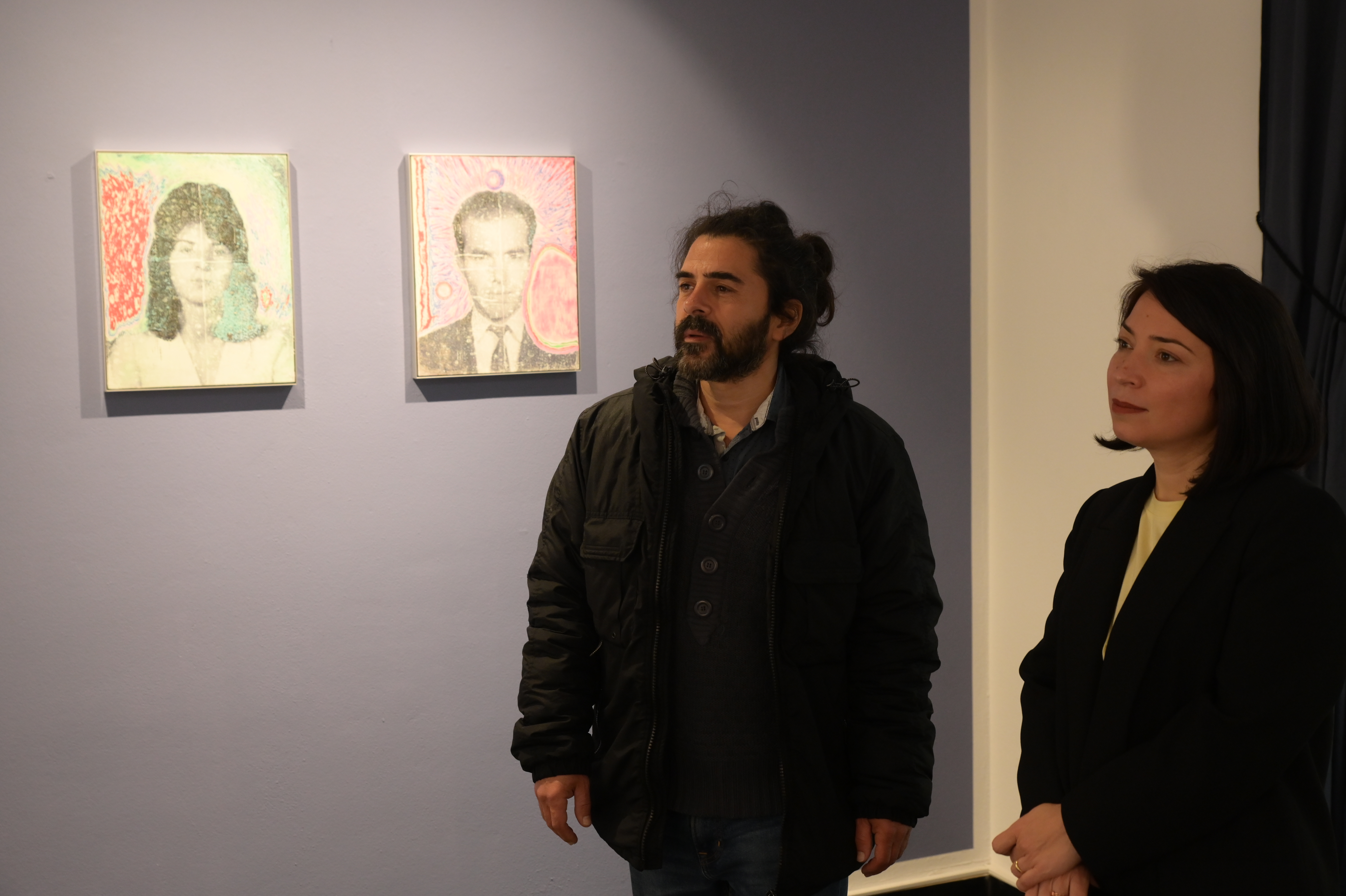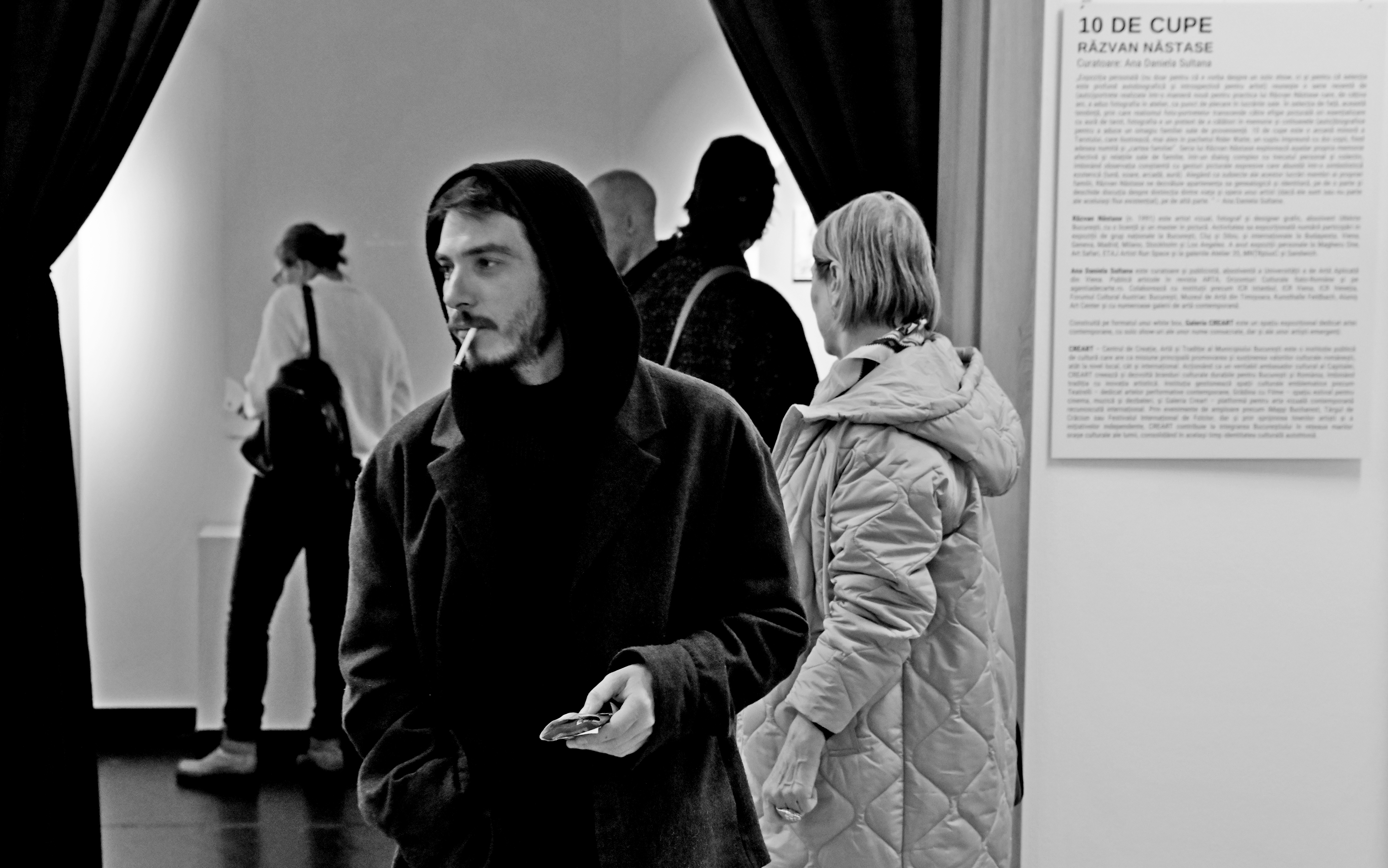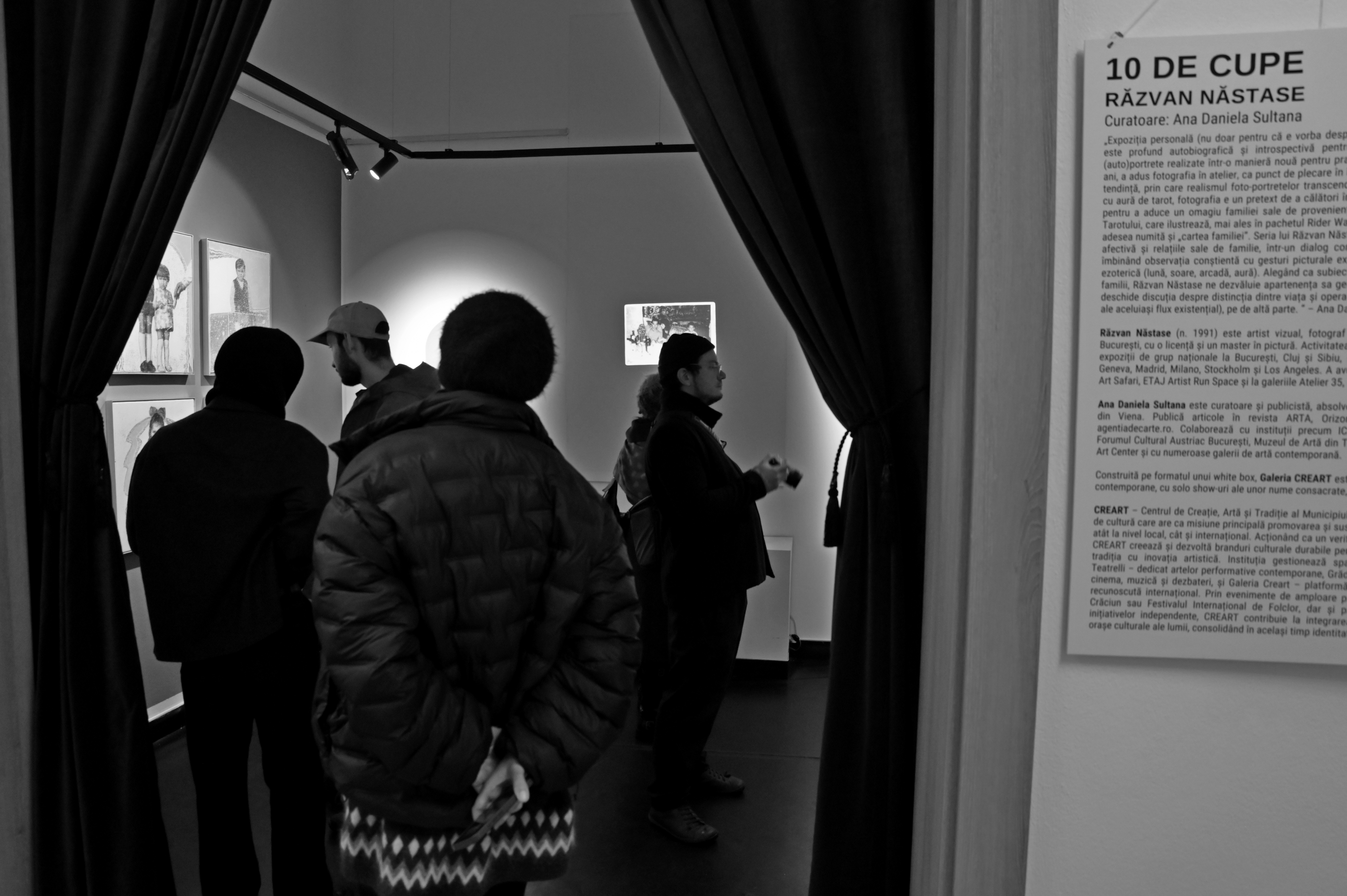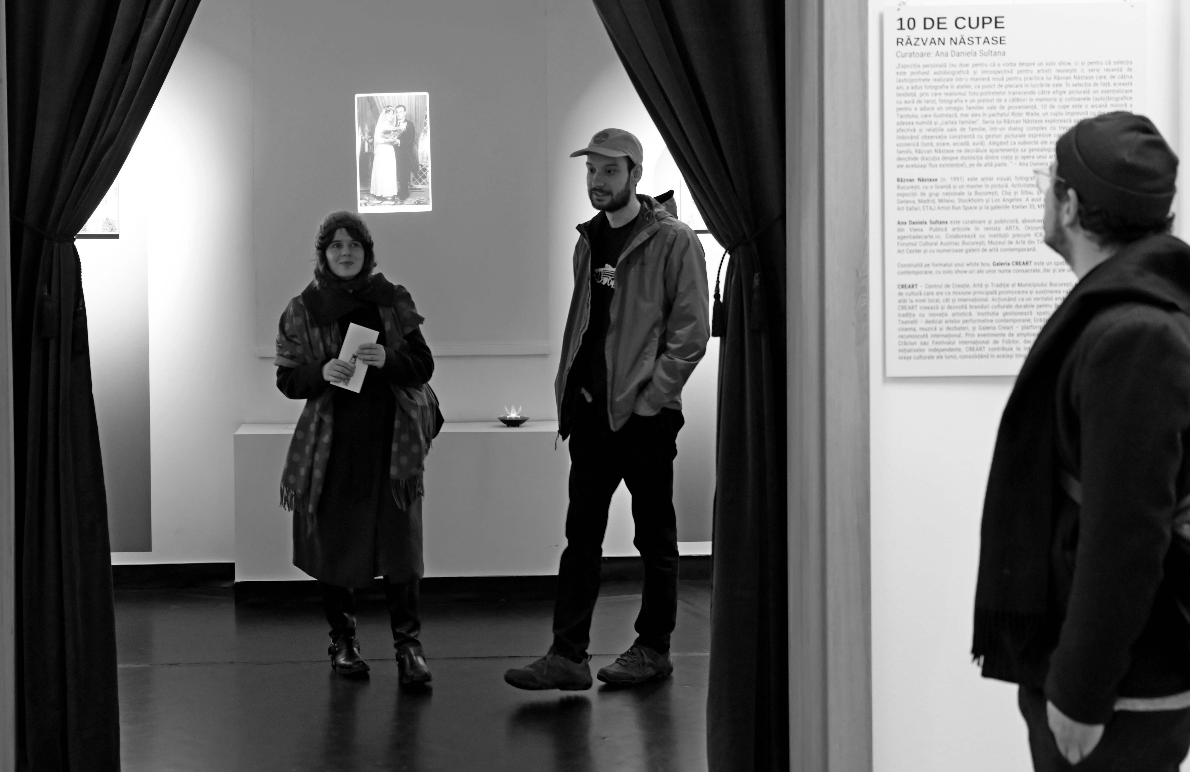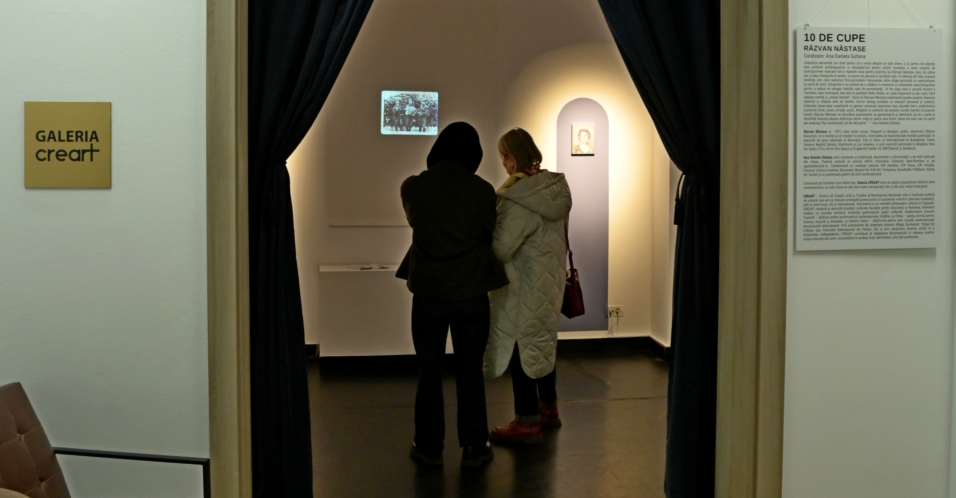 „Expoziția personală (nu doar pentru că e vorba despre un solo show, ci și pentru că selecția este profund autobiografică și introspectivă pentru artist) reunește o serie recentă de (auto)portrete realizate într-o manieră nouă pentru practica lui Răzvan Năstase care, de câțiva ani, a adus fotografia în atelier, ca punct de plecare în lucrările sale. În selecția de față, această tendință, prin care realismul foto-portretelor transcende către efigie picturală ori esențializare cu aură de tarot, fotografia e un pretext de a călători în memorie și cotloanele (auto)biografice pentru a aduce un omagiu familiei sale de proveniență. 10 de cupe este o arcană minoră a Tarotului, care ilustrează, mai ales în pachetul Rider Waite, un cuplu împreună cu doi copii, fiind adesea numită și „cartea familiei”. Seria lui Răzvan Năstase explorează așadar propria memorie afectivă și relațiile sale de familie, într-un dialog complex cu trecutul personal și colectiv, îmbinând observația conștientă cu gesturi picturale expresive care abundă într-o simbolistică ezoterică (lună, soare, arcadă, aură). Alegând ca subiecte ale acestor lucrări membri ai propriei familii, Răzvan Năstase ne dezvăluie apartenența sa genealogică și identitară, pe de o parte și deschide discuția despre distincția dintre viața și opera unui artist (dacă ele sunt sau nu parte ale aceluiași flux existențial), pe de altă parte. ” – Ana Daniela Sultana